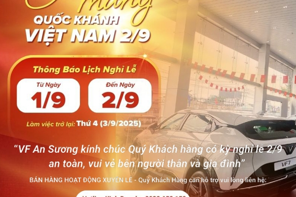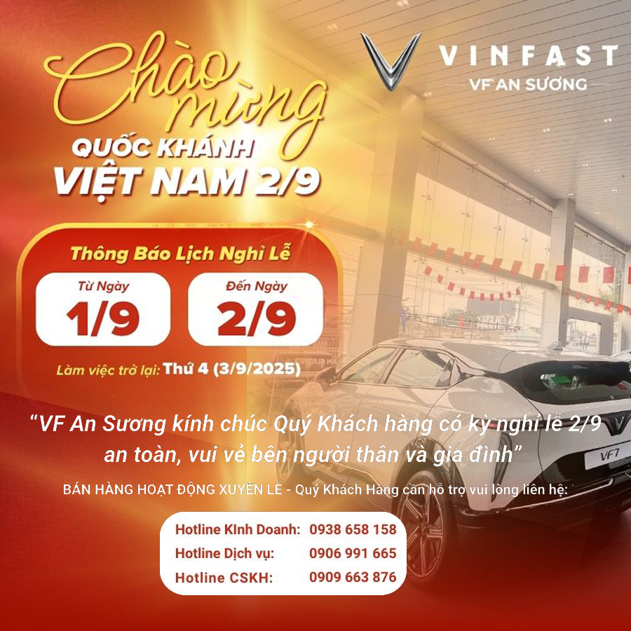 "Nhân dịp Quốc khánh, VinFast VF An Sương xin kính chúc Quý Khách hàng, Quý Đối tác và Gia đình một kỳ nghỉ thật ý nghĩa, tràn đầy sức khỏe, hạnh phúc và bình an."